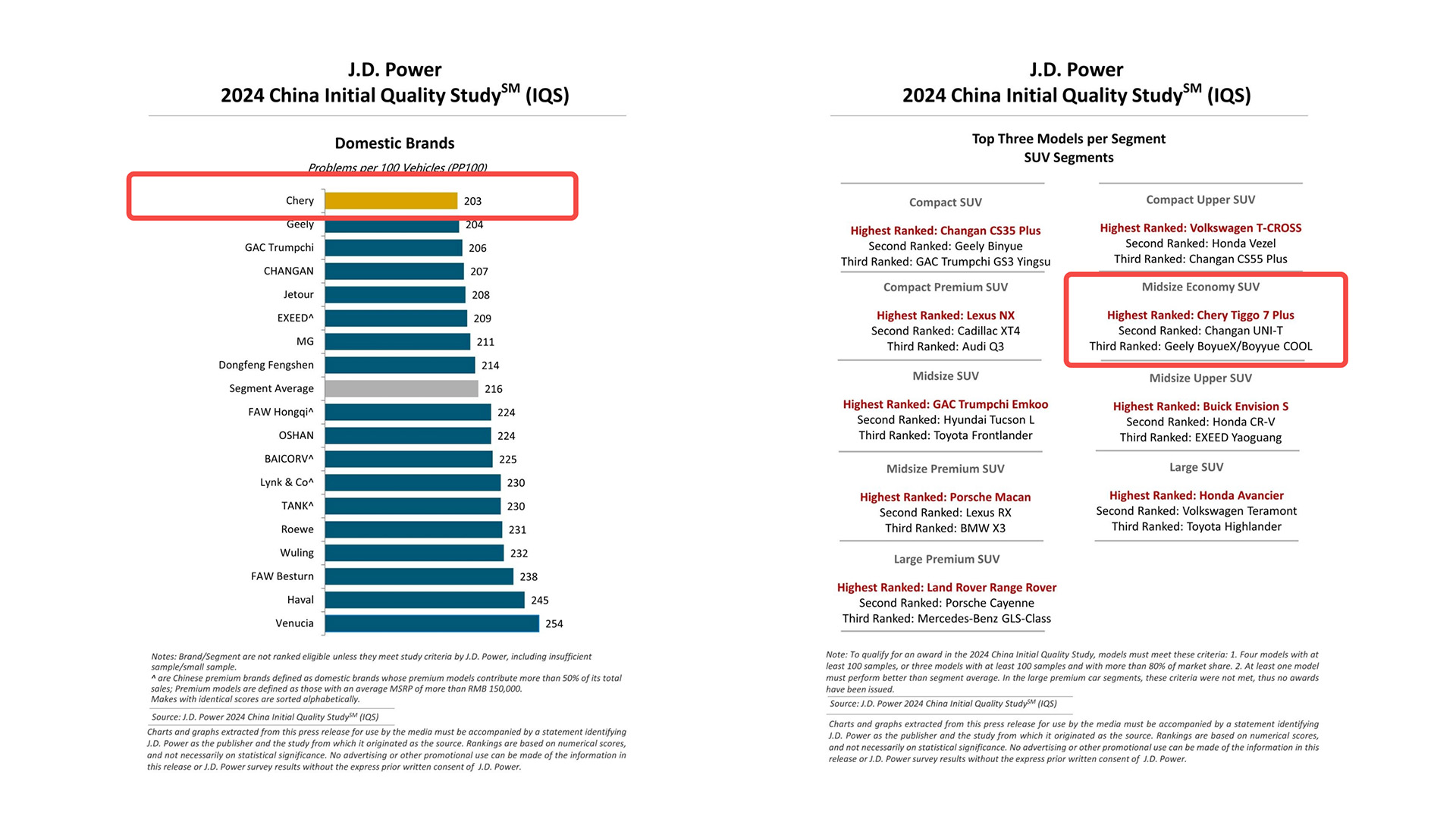 По результатам исследования качества новых автомобилей в Китае за 2024 год (2024 Initial Quality Study (IQS), обнародованной всемирно известным консалтинговым и исследовательским агентством J.D. Power, марка CHERY снова заняла 1-ое место среди китайских отечественных брендов в массовом сегменте.